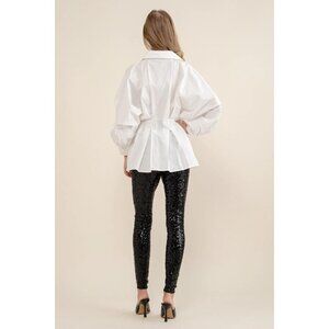 Women’s White Button-Down Peplum Top – Pleated Waist, Puff Sleeves