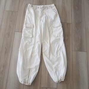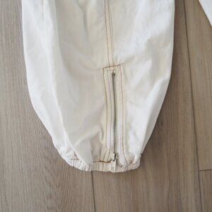 Womens White Cargo Pants With Brown Embordary And Zippers Elastic Ankle Sz Small