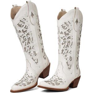 ⚡Women's White Cowboy Boots Western Boots Chunky Heel Pointed Toe Rhinestones