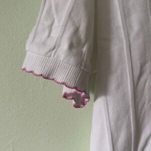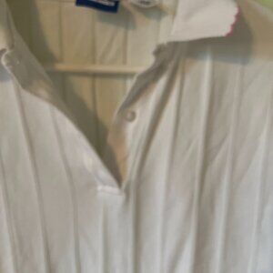 Women's EP Pro knit top, great for golf. White polo style with contrasting pink trim on collar and sleeves. Collared with 2 buttons (a star on each button), short sleeve. Vertical patterned lines add a nice detail. Length is 25", chest measurement (pit-to-pit) is 19". Banded sleeves.