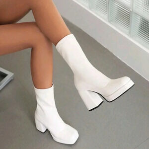 Women's White Elegant Solid Color Elastic Ankle Boots, Square Toe, Chunky Heel,