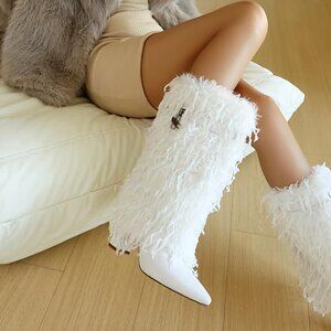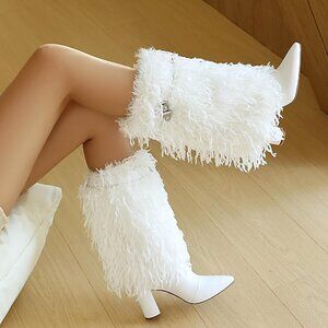 ⚡Women's White Fold Over Faux Fur Mid Calf Boots Chunky Heel Point Toe