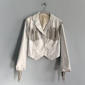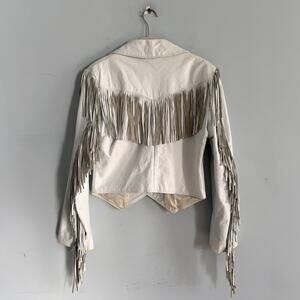 Stylish and chic, this white leather jacket features eye-catching fringe details. Perfect for adding a touch of flair to any outfit.