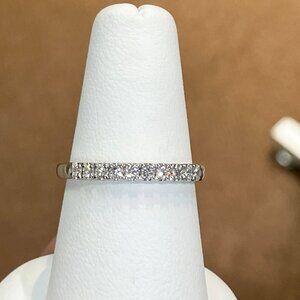The item is a 14k white gold women's diamond wedding ring. The ring consists of 10 natural round diamonds that are prong set. Each diamond has four prongs holding it in. The diamonds have a G color and an SI1 clarity grading. The diamonds weigh 0.25 carats total weight. The ring is a finger size 6 1/4 and weighs 2.1 grams. We will provide a ring box.