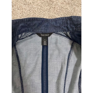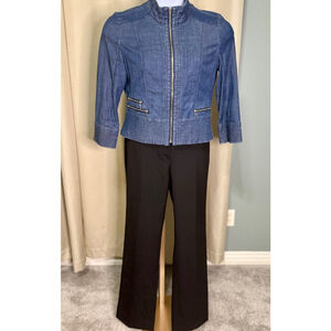 This pre-owned women's denim jacket is from the brand White House | Black Market. It features a zip-up front closure, three-quarter sleeves, and two zippered pockets at the waist. The jacket is made from a medium-weight denim fabric and has a slightly fitted and cropped silhouette. Measurements in photos. The tag reads 12 but this runs small!! It would best fit a 8/10 so I’ve listed as medium. The jacket shows minor signs of wear consistent with previous use, but remains in good condition. There are no significant stains or tears. The color is a classic medium wash denim blue. The zipper functions smoothly. The jacket is suitable for casual or business casual.