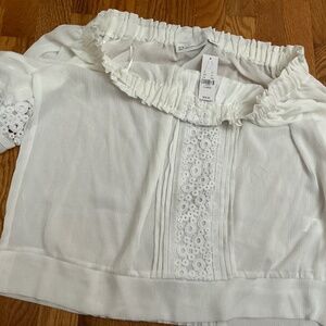 Elevate your style with this delicate white lace top, featuring intricate lace detailing along the sides for a touch of elegance. Lightweight and breathable, it’s perfect for dressing up with skirts or keeping it casual with jeans. The flattering fit and feminine accents make it a versatile piece for work, brunch, or special occasions. Add a timeless, chic element to your wardrobe with this must-have top. This is a very high quality blouse that has not been worn and is in great condition!