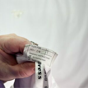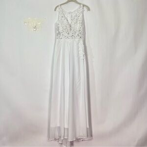 Bust pads. Back center zip. Slight small train in back. Never worn- no tags. Lace appliqués throughout top of dress with chiffon bottom.