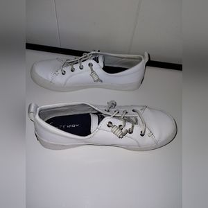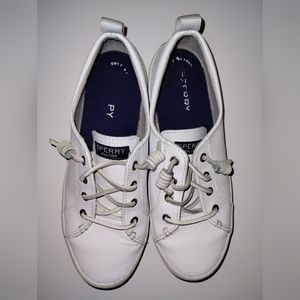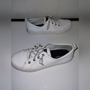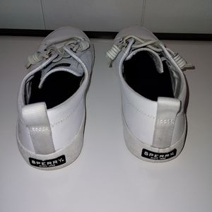 Women's white leather Sperry shoes in size 7 with white leather shoe laces. These have been worn & could use a good scrub to bring back its shine. From a smoke free home.