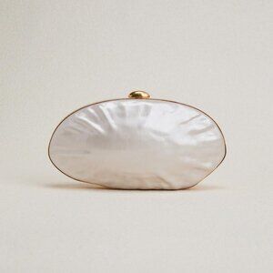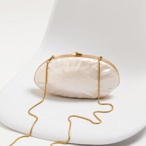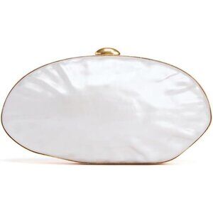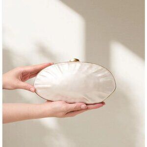 ELEGANT DESIGN: Luxurious pearl shell evening clutch with sophisticated gold-tone metal frame and smooth ivory acrylic construction