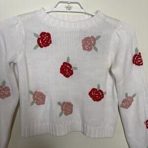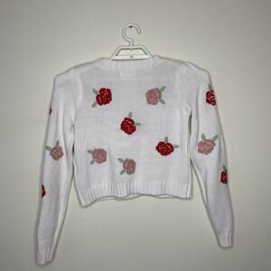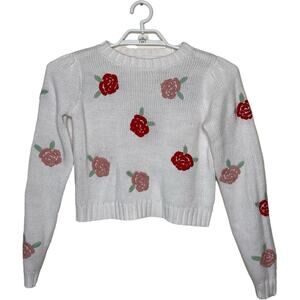 Women's White Pink Rose Embroidered Rose Flowers Cropped Sweater Twee Cottage M