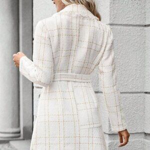 Women's White Preppy Plaid Pattern Raw Trim Double Breasted Belted Tweed Dress