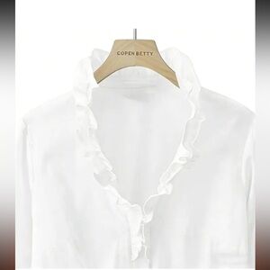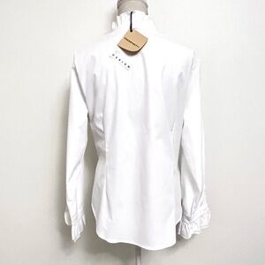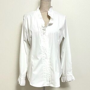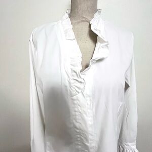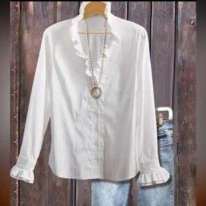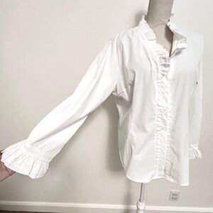 Elegant white blouse with ruffle details, perfect for any occasion. Tailored for a great fit! New with tags.