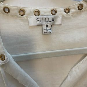 Shilla the Label. Women’s white ruffled blouse. Excellent condition and a great spring and summer top! Pairs nicely with high waisted bottoms. Slightly cropped.