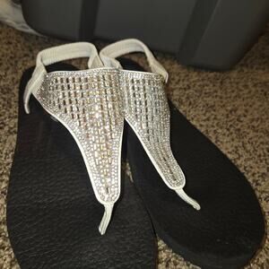 Step out in style with these elegant white sandals featuring sparkling rhinestone detailing. Perfect for any occasion, these sandals offer both comfort and glamour. Only worn a few times. Tanner on the inside. Not dirt!
