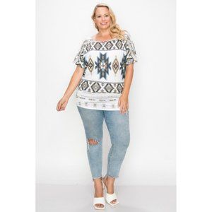 Geometric-Tribal sublimation print top, featuring a boat neck and ruched sides detailing.