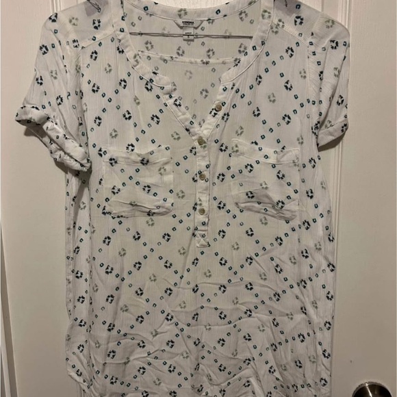 Stylish women's top featuring a white base with a blue and teal pattern. Perfect for casual outings or a day at the office.