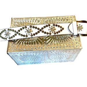 White Faux Leather Small Womens Studded Belt Rhinestone Brass Buckle Flawed