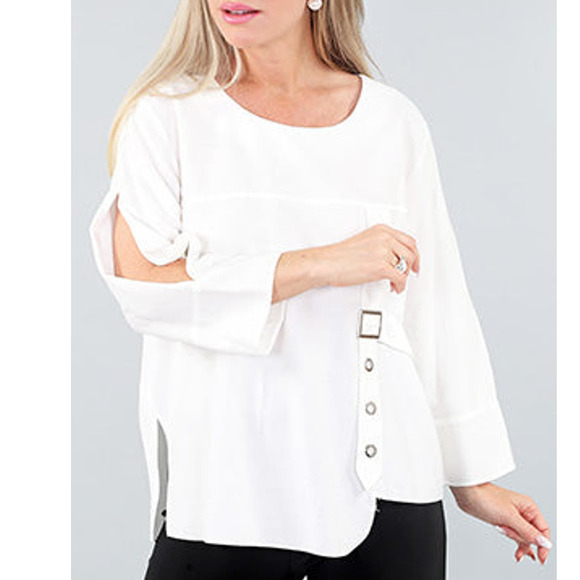 Elevate Your Style: White Top with 3/4 Cutout Sleeve and Buckle