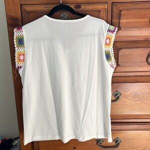 Women’s White V-Neck Top With Granny Squares on Shoulder Size XL NWOT