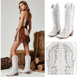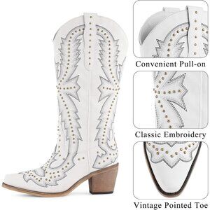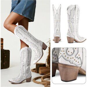 ⚡Women's White Western Cowgirl Boots Embroidered Knee High Comfortable Vintage