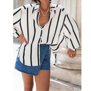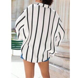 Women's White with Black Stripes Oversized Button Down Shirt Long Sleeve