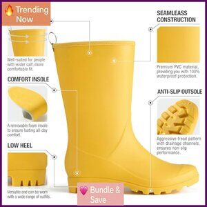 These durable, mid-calf rain boots are designed for wide calves and complete waterproof protection. Ideal for outdoor work, gardening, and navigating wet conditions with secure footing and all-day comfort.