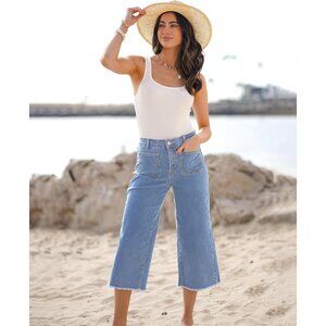 Features: These trendy wide leg cropped jeans sit high on the waist with a flattering fit and a fun, breezy silhouette. Made from stretchy cotton-spandex blend, they keep their shape wash after wash. The casual vibe is completed with a non-excessive frayed hem, perfect for laid-back summer looks or layered with your favorite tops. Four patch pockets add a classic touch.