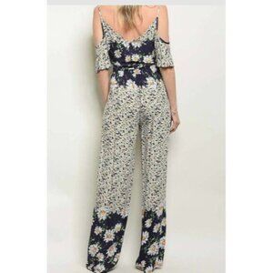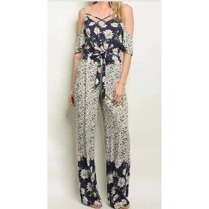 Women's Wide Leg Floral Outfit Blue Cold Shoulder Floral Print Pant Set Size L