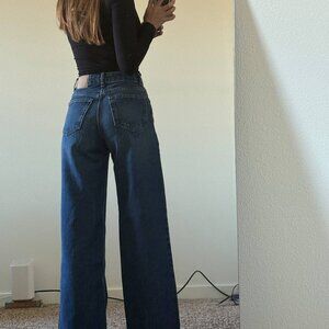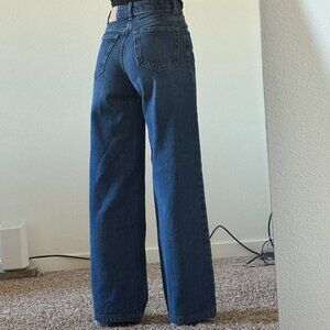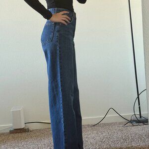Classic blue denim with a high waist and wide straight fit. Super comfortable, flattering from the front and back. Thick, good-quality fabric with no stains or damage.