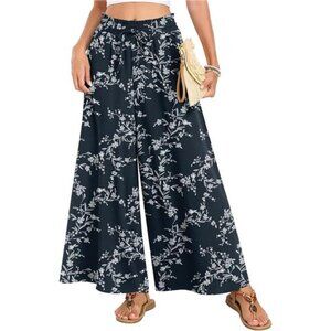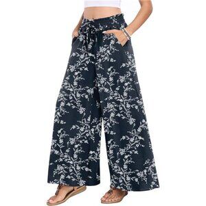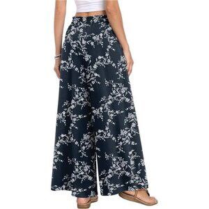 Women's Wide Leg Palazzo Pants High Waist White Carvings Navy