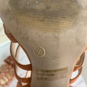 Women’s Wild Diva Gladiator Strap Zipper Sandal with short Heels. Tan Unique Sandal is pre-owned size 7