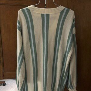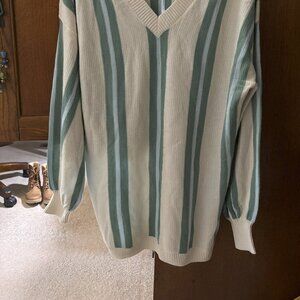 This is a soft white sweater with blue and green vertical strips. The sleeves are 23 inches with white ribbed cuffs. V-neck with white ribbed trim. The sweater measures 21 inches pit-pit and 34 inches long ending in a white rib trim around the bottom of the sweater.