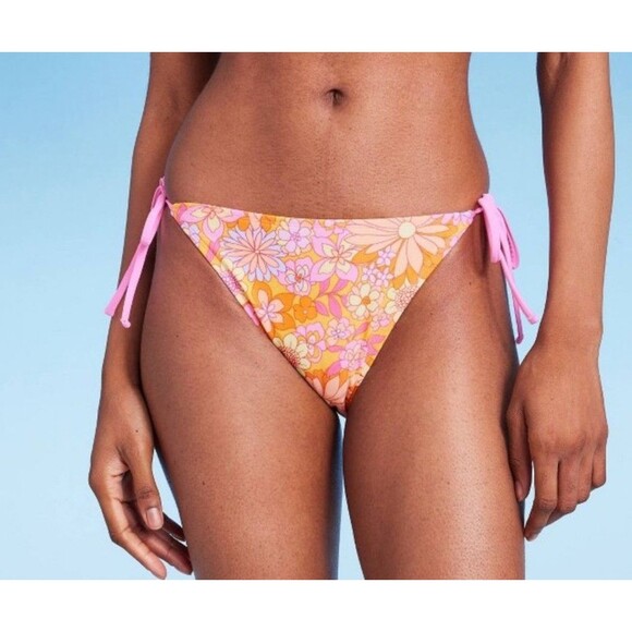 Womens Wild Fable Side Tie Bikini Bottom Pink Floral Size L