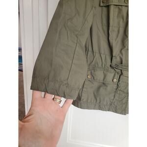 Excellent condition, Willi Smith jacket in a gray color. This is a lightweight jacket with 3/4 sleeves. This jacket snaps close and has pockets, there is no hood. There is a TINY hole under the left arm pit (see picture).