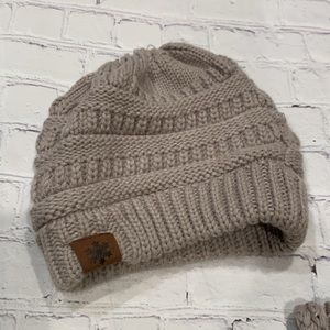 Infitnity knit scarf with ponytail beanie. Great for cold winter days. You can easily pull your ponytail through the opening from on top of the beanie for hair comfort and a stylish look. Beanie has elastic around the top for easy hair duo access. Last image is just an example of how the accessories look on a person. Listing is for a set in sand color only.
