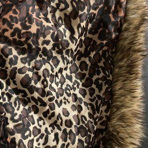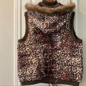 Women's Leopard Print Winter Puffer Vest. Zippered Front with Lattice Tie in Back. Trimmed with Brown Knit. Has a Detachable Fur Trimmed Hood.