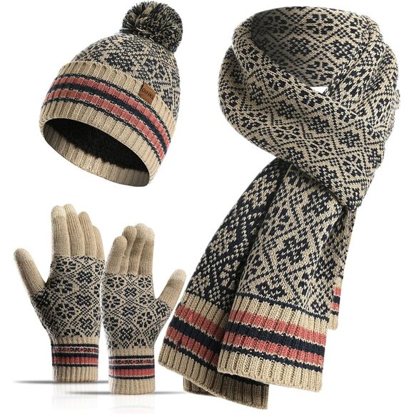 Women's Winter Warm Deep Beige Skull Caps Knit Gloves Beanie Neck Scarves 3 Set