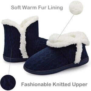 Women's Winter Warm Fluffy Fur Lined Plush Bootie Slippers Dark Blue White Shoes