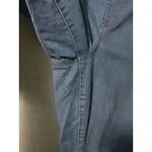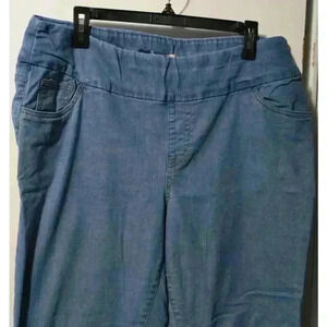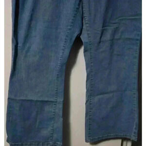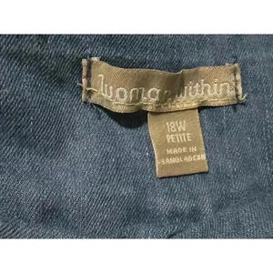 These are a pair of pre-owned Woman Within 18W Petite blue denim jeans. They have a wide leg style with a pull-on waistband. The jeans have five pockets, including two front pockets, two back pockets, and a coin pocket. The jeans are made of a soft, stretchy denim fabric. They are in good condition with no visible rips or tears. There are some minor signs of wear, such as fading and pilling. The jeans are approximately 38 inches long from the waist to the hem. The waist measurement is approximately 38 inches. The jeans are made in Bangladesh.