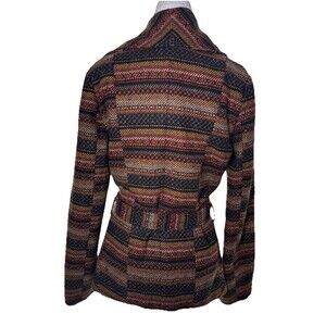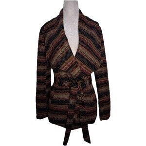 Stylish Jack wool blend cardigan jacket in size Small. Features a bold Aztec Southwestern boho stripe pattern, belted waist, and cozy wrap design. Perfect for layering and adding a chic touch to any outfit.