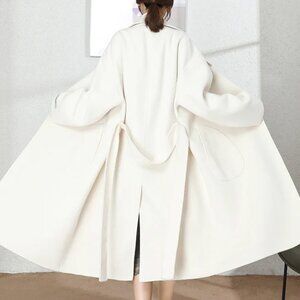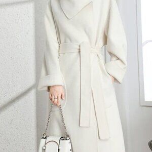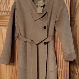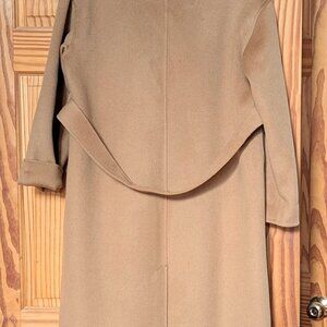 NEW WITH TAGS., Beautiful, camel color, double brushed wool dress coat. Full length, soft wool, perfect for fall through winter. Can be worn with the collar up or down. Unlined but beautifully finished inside. Size Medium, US 8/10, armpit to armpit across the back of the coat is 21". Website has measurements listed as bust 37"/38", hips 39"/40" length at back of neck to hem is approximately 44". Tags says it is hand washable.