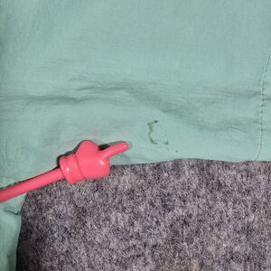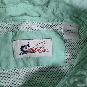 Worldwide Sportsman button-up fishing shirt, pretty & bright aqua blue, size SMALL. Tons of features: hidden buttons on button down collar, hook and loop vented chest panels with pockets, right & left zip vent panels at hip/hem, vented at shoulders and back.