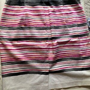 Skirt has striped pattern. Stripes are fuschia, orange, white and black. Front pleating near waist.