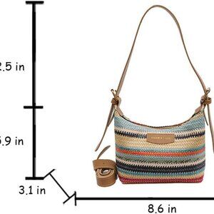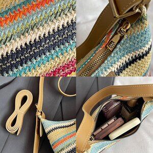 Features: Crafted from durable, lightweight straw material, this large capacity tote is perfect for the beach, shopping trips, or daily errands. It has an open-top design with adjustable straps so you can wear it as a crossbody, shoulder bag, or handheld. The colorful woven pattern adds a fun, energetic vibe to any outfit. Inside, you'll find a polyester lining to keep your valuables secure while they stay lightweight and breezy.