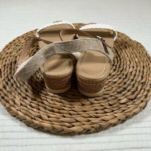 Step into style with these chic woven wedge sandals. Featuring a classic white and tan design, these shoes are perfect for any occasion. Enjoy comfort and elegance with every step.
