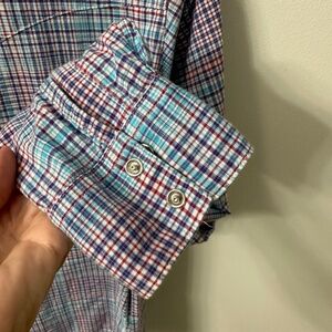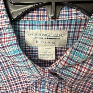 Wrangler Blue Plaid Check in Blue and Red Stripes Button Up Collared Shirt Size Large.