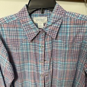 Women's Wrangler Blues Long Sleeve Button Down Plaid Shirt Size L GUC