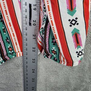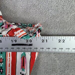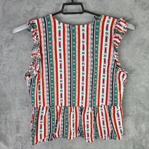 This sleeveless peplum top features a vibrant striped pattern with ruffle trim and a flattering V-neck design. Ideal for casual or semi-formal settings.