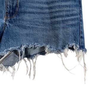 These jean shorts are gently used and feature distressed hemline, traditional 5-pocket design, denim construction, Button and zipper fly.