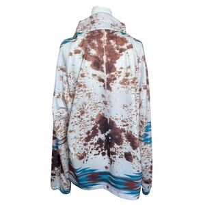 Cozy and stylish women’s quarter zip pullover in a bold brown and teal Aztec-inspired print. Features a soft, lightweight feel with long sleeves and a mock neck collar. Great for layering during transitional weather or lounging in comfort. Size XL with a relaxed fit.